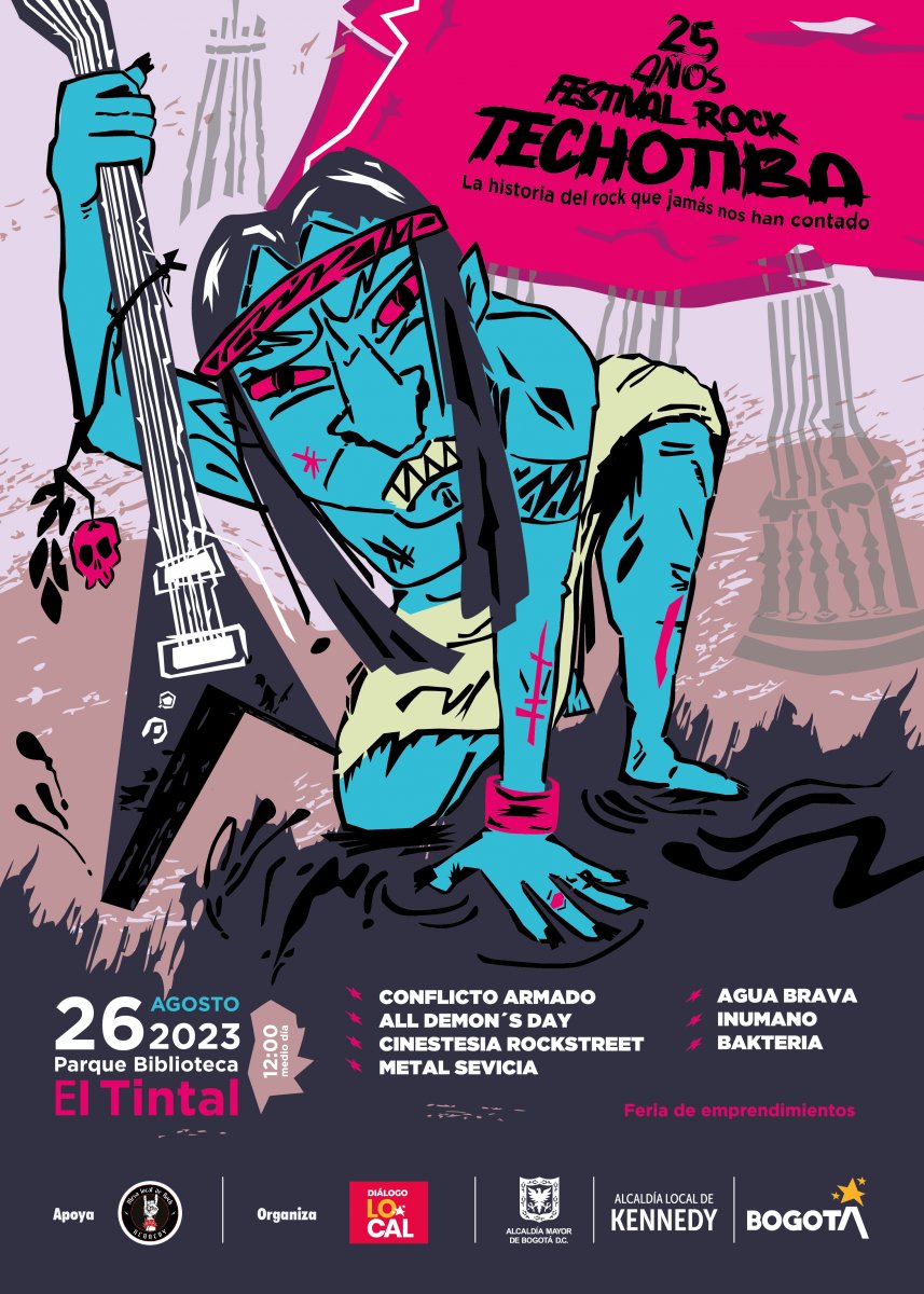 Por eso te invitamos este 26 de agosto 2023 en el parque Tintal desde el mediodía, a conmemorar la lucha por preservar la memoria de nuestros pueblos, la lucha por la resistencia que como movimiento hemos heredado de nuestros taitas, de nuestras montañas y lagunas, de nuestras tinguas. De las calles y plantones, a la resignificación del Festival más libre y rebelde del territorio. ¡Del ahora en adelante... TECHOTIBA ROCK...! Recordando 25 años de historia. (1998- 2023) donde la memoria nos permitirá narrar a las generaciones que jamás nos habían contado esta historia, pero que son ahora ellos, quienes podrán decir...