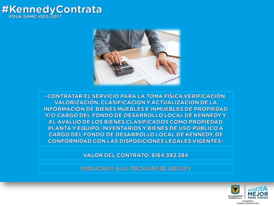 Contratar el servicio para la toma física, verificación, valorización, clasificación y actualización de la información de bienes muebles e inmuebles de propiedad y/o cargo del fondo de desarrollo local de Kennedy y el avaluó de los bienes clasificados como propiedad planta y equipo, inventarios y bienes de uso público a cargo del fondo de desarrollo local de Kennedy, de conformidad con las disposiciones legales vigentes.